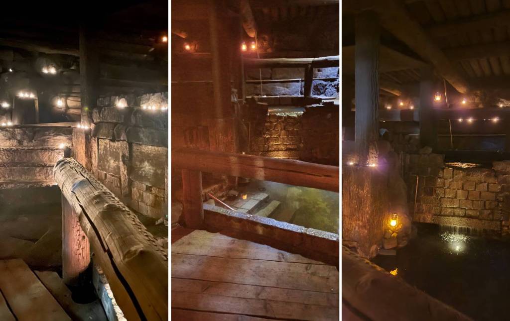Saunaa voi varata yksityiskäyttöön, mutta 1-3 kertaa kuukaudessa siellä on myös yleisövuoroja. Me olimme sellaisella juurikin. Saunan lauteet vetää hyvin väkeä, löylyt ovat hyvät ja kosteat. Puro solisee saunassa tuoden tunnelmaa. Vesialas saunan sisällä on kokemus itsessään, se on viileää, muttei liian kylmää kuitenkaan. Siinä voi lillua ja nauttia löylyistä. Ota kuitenkin muutkin saunojat huomioon, sillä pieneen vesialtaaseen ei kerralla moni mahdu. Saunan ulkopuolella virtaa sama puro, jonne pääsee myös uimaan. Siinä vesi tuntui paljon kylmemmältä!