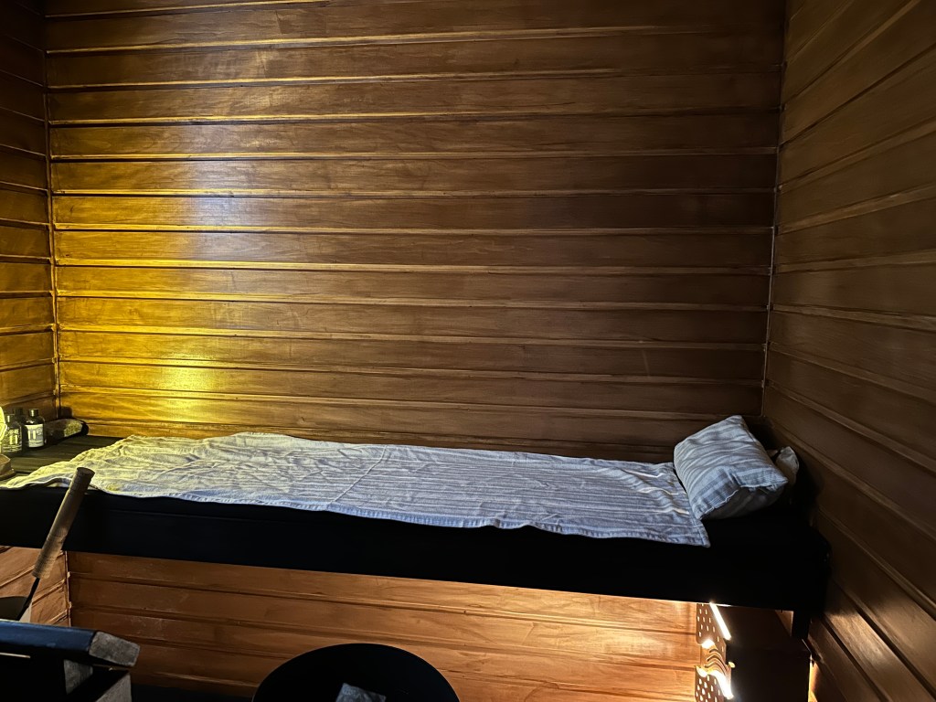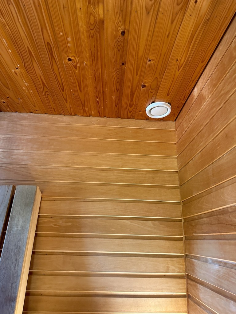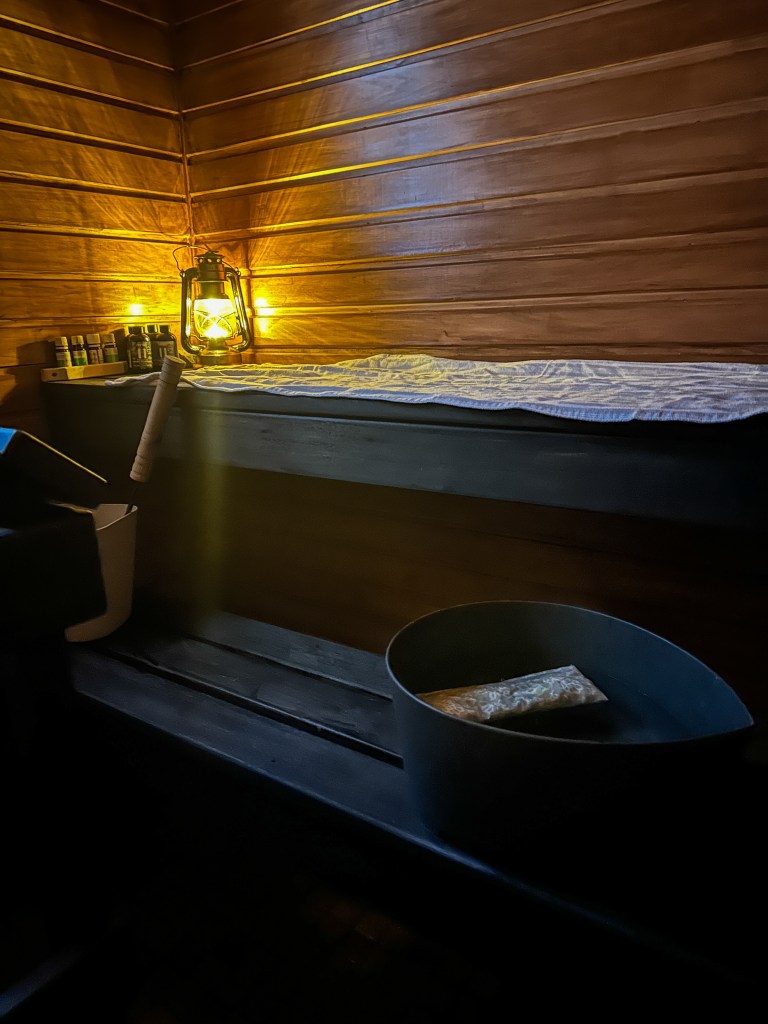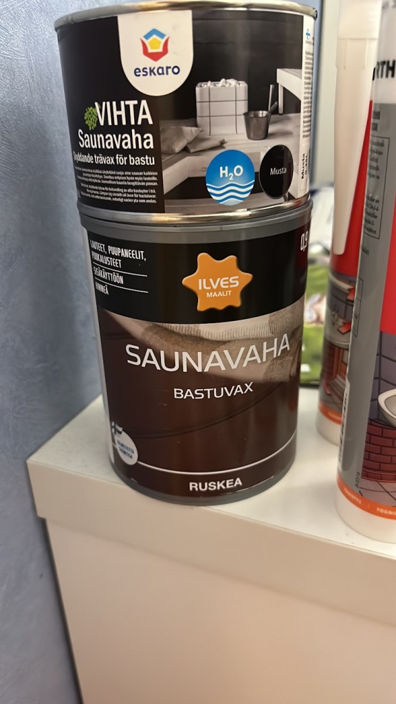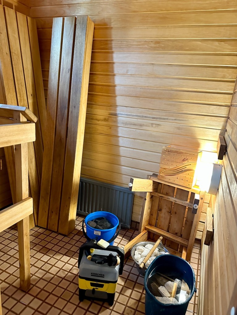 Saunan seiniin valikoitui ruskea saunavaha ja lauteisiin musta saunavaha. Lauteet pestiin painepesurilla ja hiottiin. Sauna myös tottakai pestiin lattiasta kattoon.