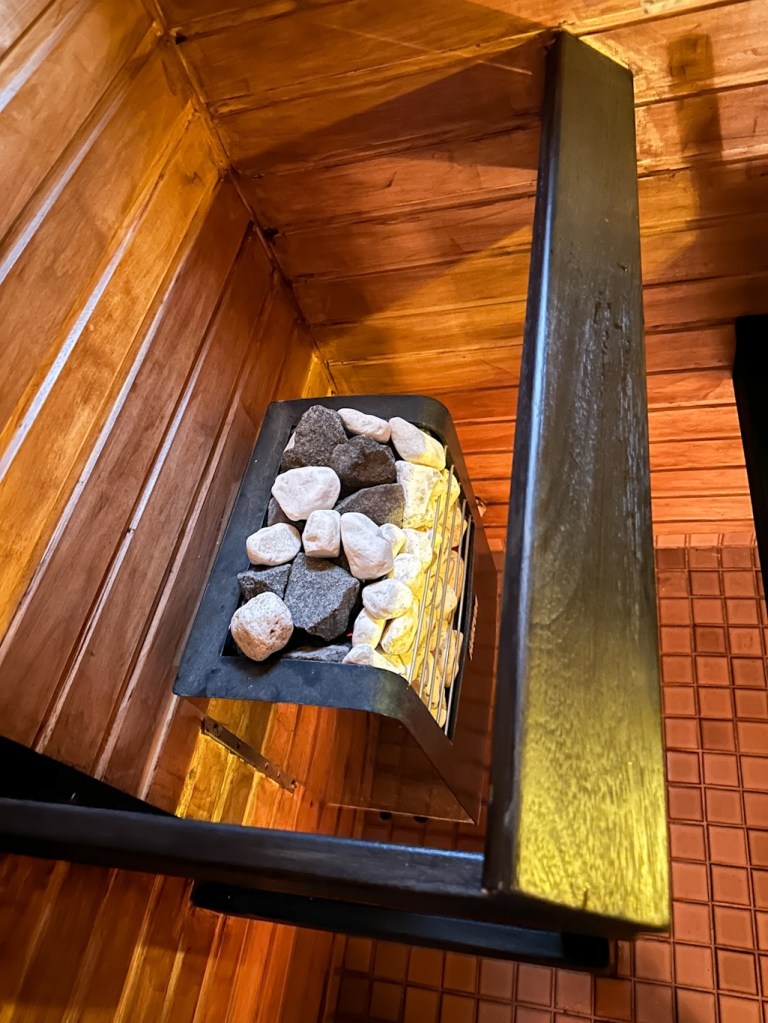 Samalla nostin kivet kiukaasta, pesin ja ladoin uudestaan, vähän eri järjestykseen kuin ennen. Meillä on tuollainen Harvian edestä avoin todella hyvä sähkökiuas, olen sellaisen ostanut lapsuudenkodin sisäsaunaan ja kun täällä hajosi kiuas, niin hommasin samanlaisen myös omaan kotiin. Tykkään kivistä, niin tottakai meillä on valkoisia kiviä kiukaassa 🥰