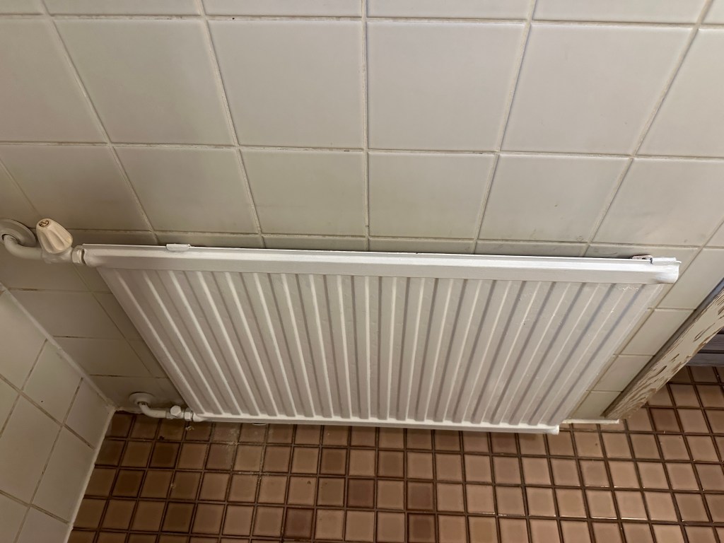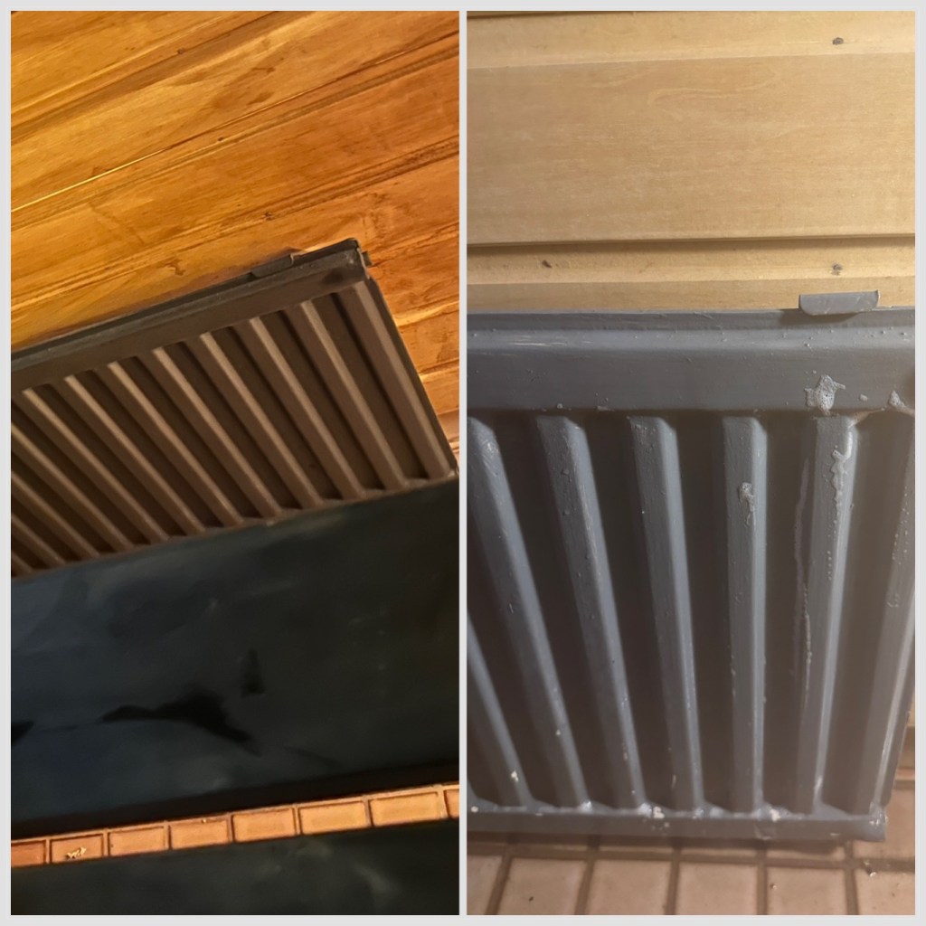 Vaaleaa paneelia seinät, katto ruskea ja ruskeaa kaakelia. Sauna ei ole mikään iso. Saunan patterin väri ei istunut yhtään värinsä puolesta, siniharmaa? Suihkun puolella taas valkoinen patteri kaipasi uutta väriä pintaan, niin päätettiin maalata kumpikin patteri uudestaan. Mutta, kun saunasta oli tulossa tumma, niin mieheni päätti, että saunan patterista ei tule valkoinen vaan musta, mutta mustaa patterimaalia ei ole, niin maaliksi valikoitui Maston spraymaali takka- ja uuni 450°C musta ja suihkun puoleinen patterin maali on Maston spraymaali patterimaali 400ml kiiltävä valkoinen ja suihkun patteriin tuli myös pohjamaali Maston spraymaali Rust-primer 400ml harmaa eli pohjatyöt tehty myös.