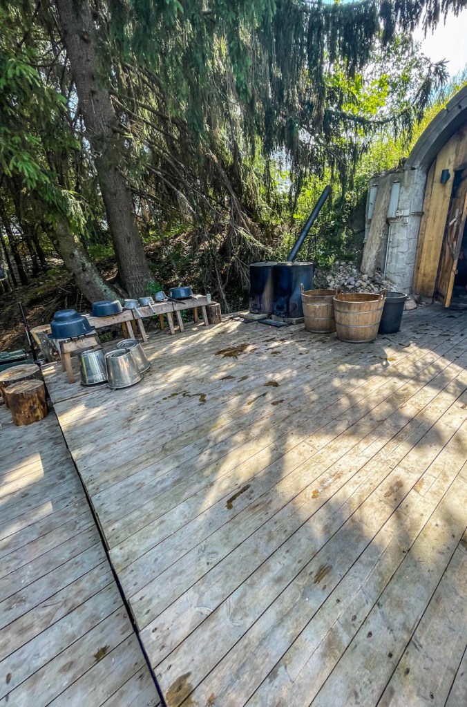Pesut tapahtuu joko saunan edessä olevilla vesillä, padassa on lämmintä vettä ja myös kylmää vettä löytyy. Suihku löytyy ylhäältä tuvasta. Saunan luona voi myös nauttia luonnonrauhasta 🌿 ja myös nauttia vaikka eväitä 🍪 ja pitää nestetasapainosta huolta saunomisten välissä 💧