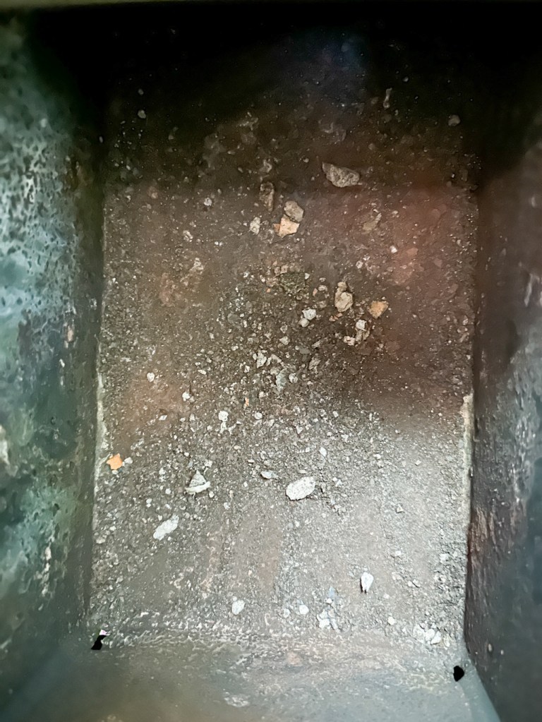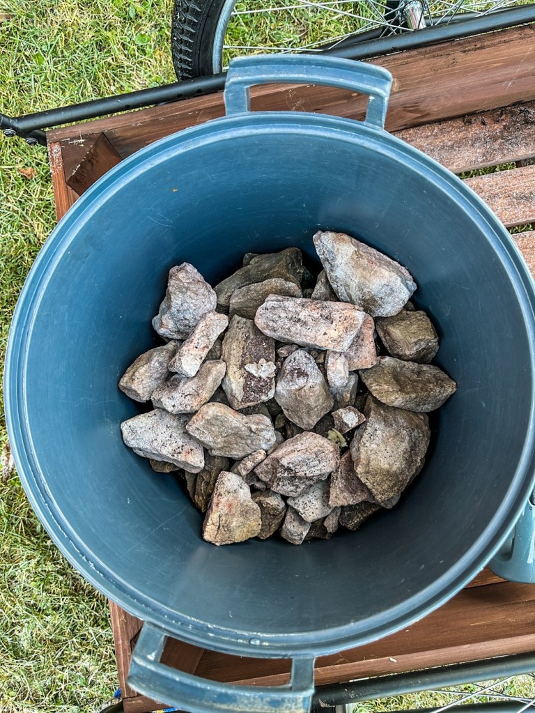 Kiukaan kivien tarkistus/vaihto aloitetaan nostamalla saavi tai sanko kiukaan viereen. Kivet nostetaan astiaan ja kun kivet on poistettu, niin poistetaan murut ja muu roska pohjalta (hiiret oli piilottanut tiilen paloja ja lasivillaa kivien väleihin 🐭)