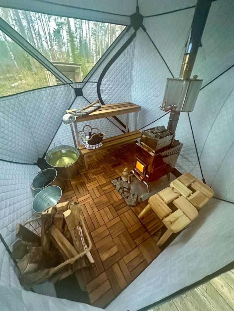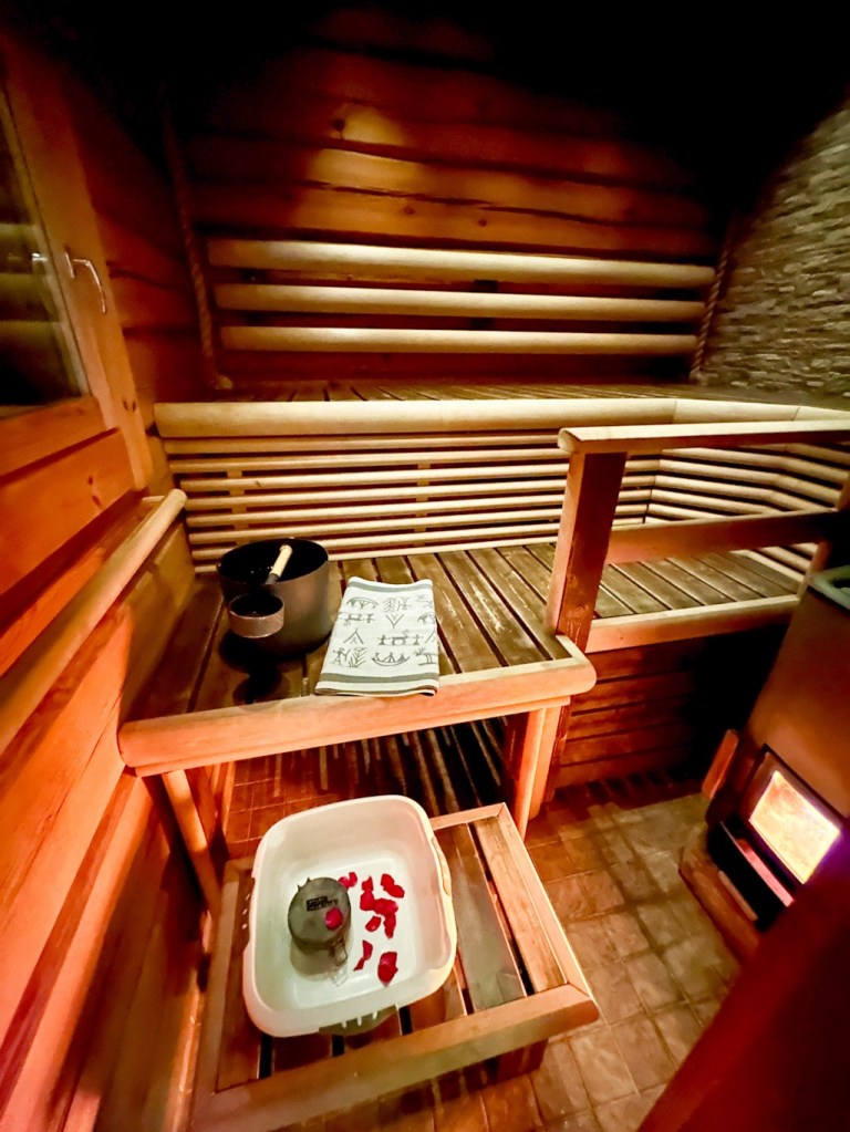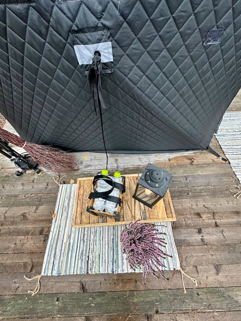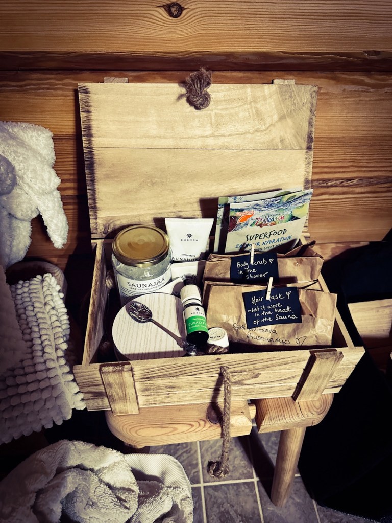 Ruokailun jälkeen pääsimme testaamaan niin sanotun pääsaunan, puulämmitteinen hirsisauna rannalla. Saunalla oli wc (joka oli meidän telttailijoiden käytössä), pieni keittiö (sekin käytettävissä ja tarjolla oli lämpimiä juotavia koko ajan käyttöön) ja suihku. Täällä oli huomioitu kyllä kaikki, löytyi rasvoja, hiusmaskeja, kuorintoja, jalkakylpyä, saunatuoksua ja erikoisimpana saunajäätä – sitä kun pisti kiukaalle valtasi saunan raikastava mentholtuoksu.