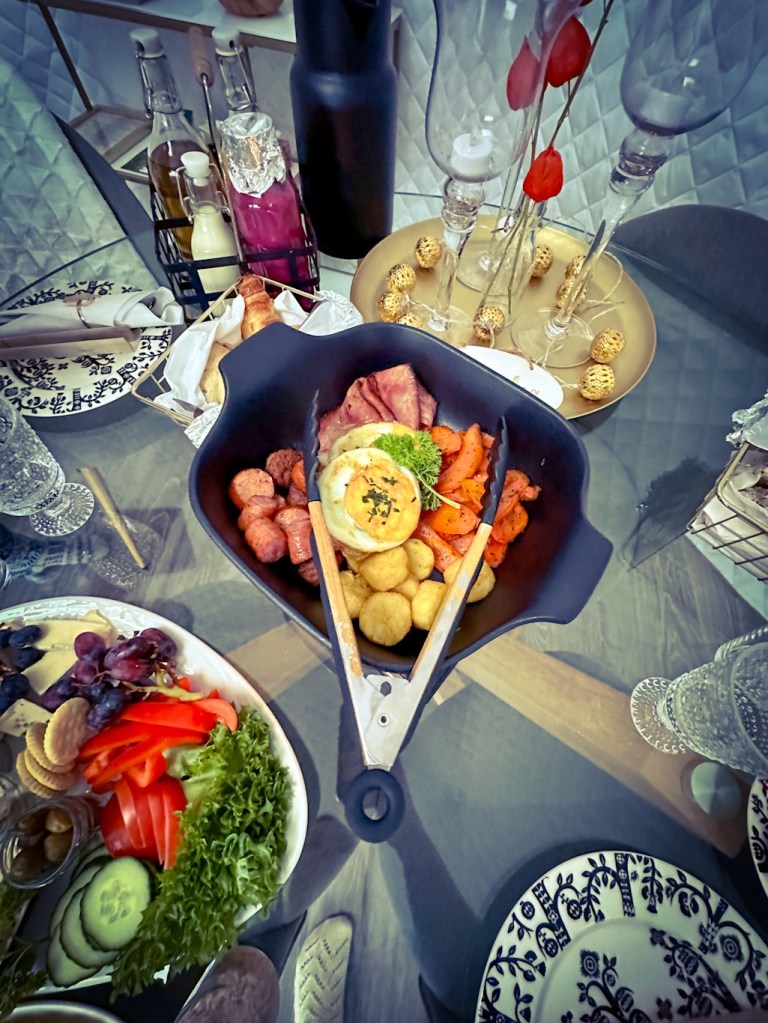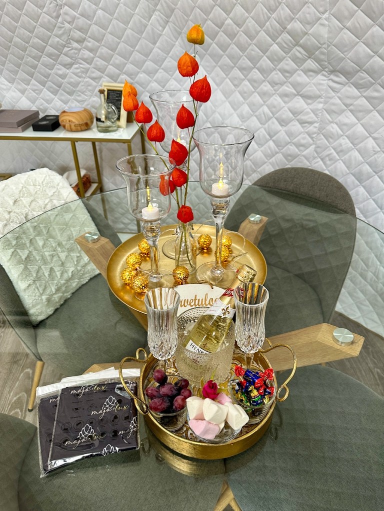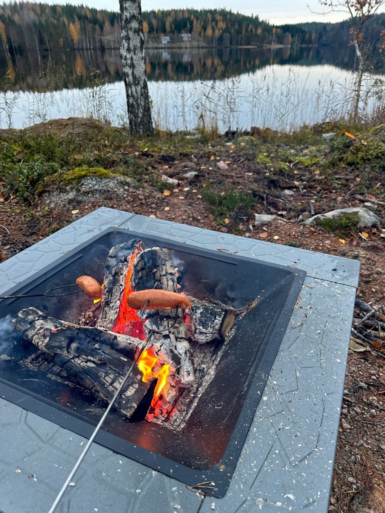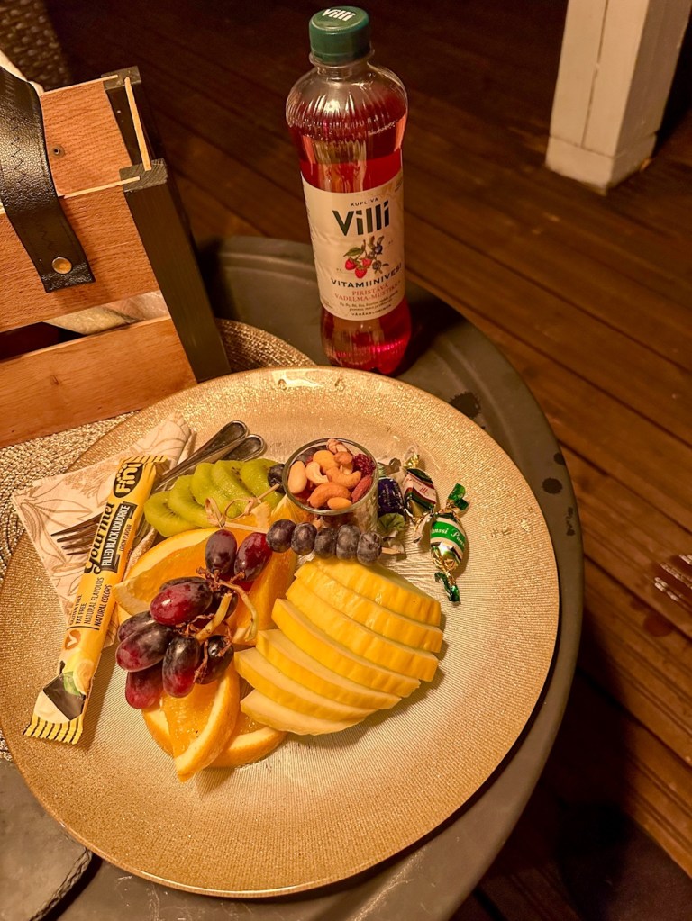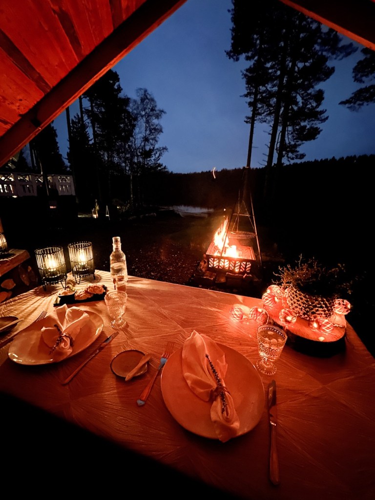 Heti saavuttaessa pöydällä odotti meitä tervetulijaismaljat herkuilla ja sen jälkeen suuntasimme testaamaan Tarinan telttasaunan. Telttasauna oli omassa rauhassaan, siellä oli nuotiossa valkeat ja järvinäkymät. Uimaankin olisi päässyt rannasta. Sauna oli kompakti ja siellä oli uskomattoman kosteat löylyt! Tarjolle oli laitettu vettä ja makkaraa sai paistaa nuotiolla saunomisen ohessa.
