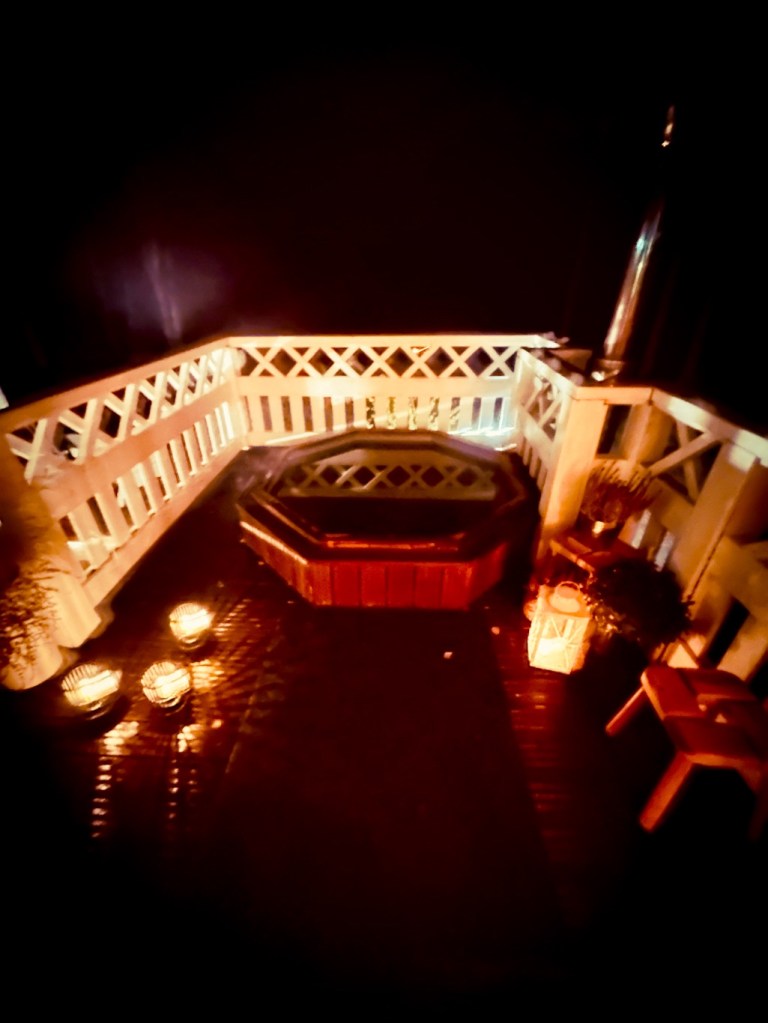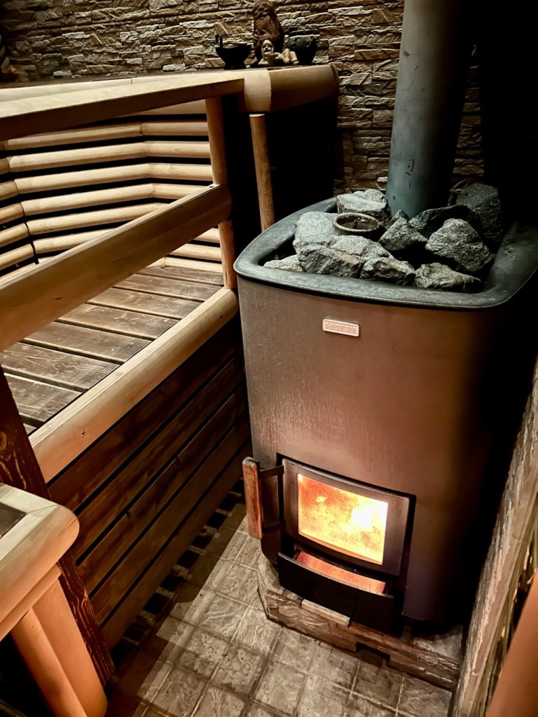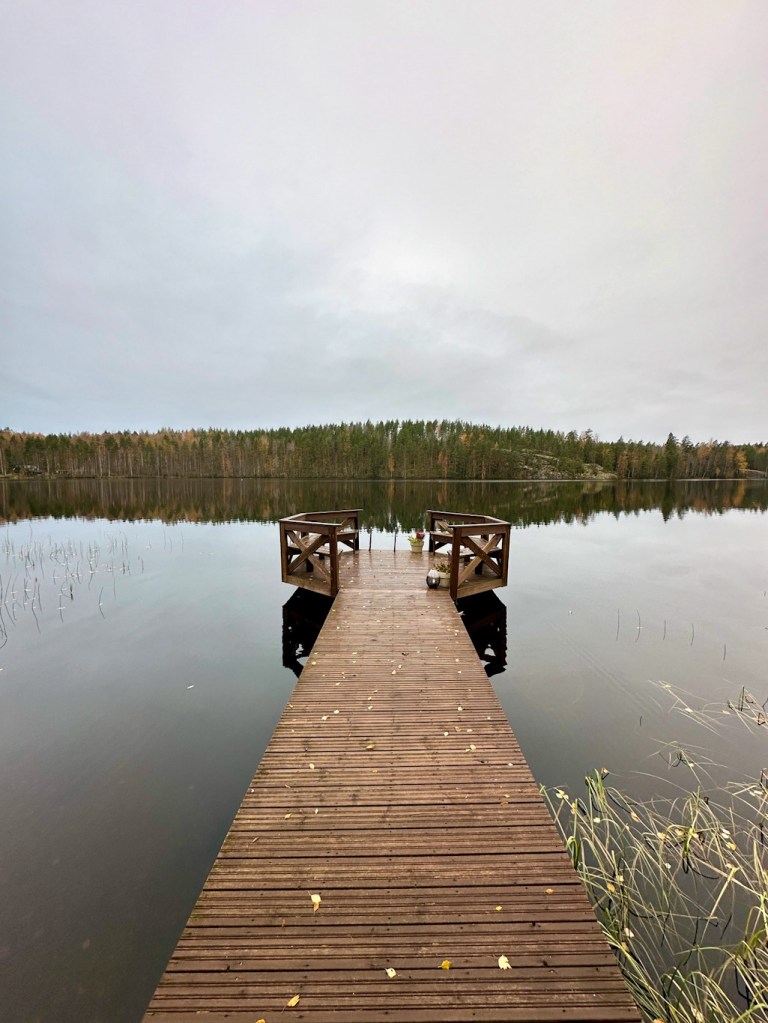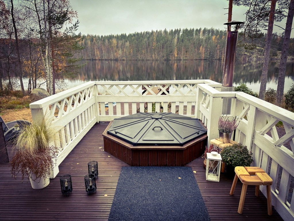 Saunassa oli pehmeät löylyt, joissa viihtyi pitkään. Myös palju terassilla oli lämmitetty ja jos emme saunoneet, olimme paljussa. Terassille oli katettu lämpölampun alle virkistävää juotavaa ja pientä saunanaposteltavaa. Saunalta olisi päässyt laiturilta myös uimaan, Anne itseasiassa aamu-uinnilla kävikin!