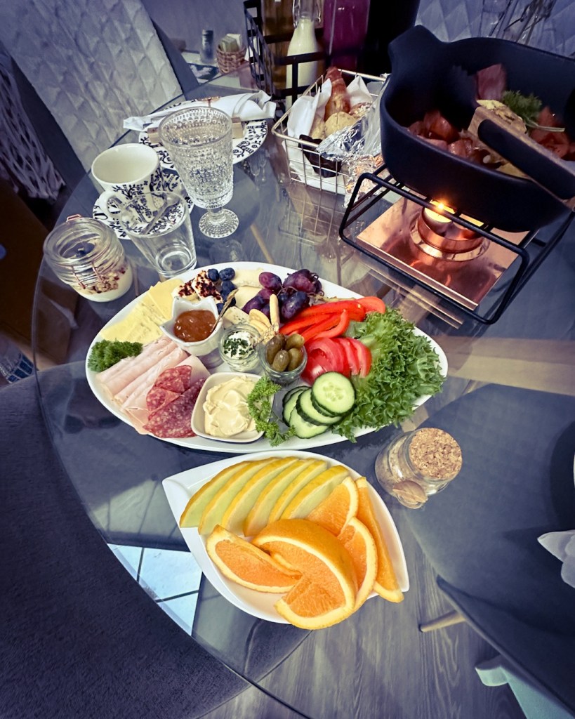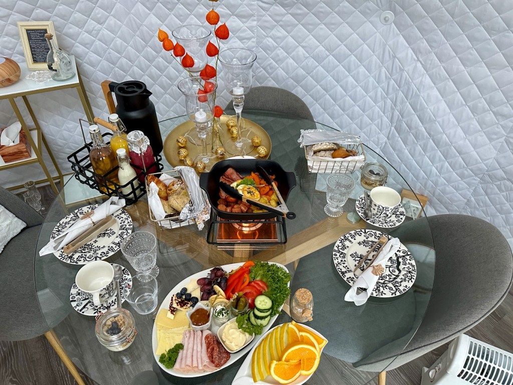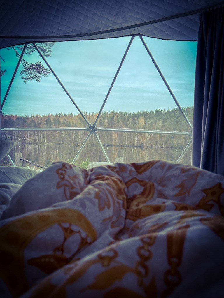 Päivän päätteeksi oli ihana käpertyä muhkean peiton alle sänkyyn ja nauttia täydellisestä hiljaisuudesta. Aamulla oli upea herätä järvinäköalaan ja vain nauttia. Aamupala tai oikeastaan aamubrunssi tuotiin toiveidemme mukaan telttaan. Aamupala oli laaja ja herkullinen.