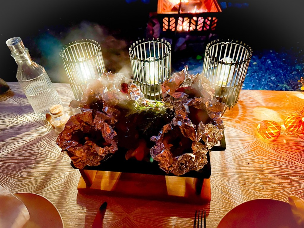 Saunottuamme suuntasimme takaisin omalle teltalle, jossa oli mukava levätä ja tuijotella luontomaisemaa nenän edessä lämpöisen teltan sisällä. Hetken päästä meidät kutsuttiin syömään ja paikan pitäjä Marjo oli kokannut meille tuhkaperunoita savuporotäytteellä, härkää ja kasviksia. Lisäksi oli itseleivottua gluteenitonta sämpylää. Marjo oli todella hyvin huomioinut erityisruokavaliot ja kaikki oli herkullisen maukasta. Ruoka tarjoiltiin laavulla, jossa oli tulet tunnelmaa luomassa. Kuitenkaan itse tässä telttailussa tarvinnut ruokaa valmistaa, vaan kaikki tarjoiltiin valmiina suoraan nenän eteen.