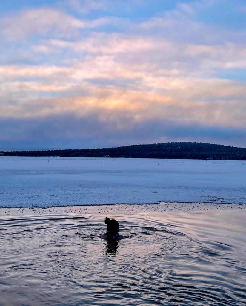 • Pelkkä kastautuminen on myös ok – Ei ole oikeaa tai väärää tapaa käydä avannossa. Voi kastautua, jos uinti ei tunnu hyvältä. Voi olla paikallaan ja hengitellä. Tee niin, mikä tuntuu parhaalta.